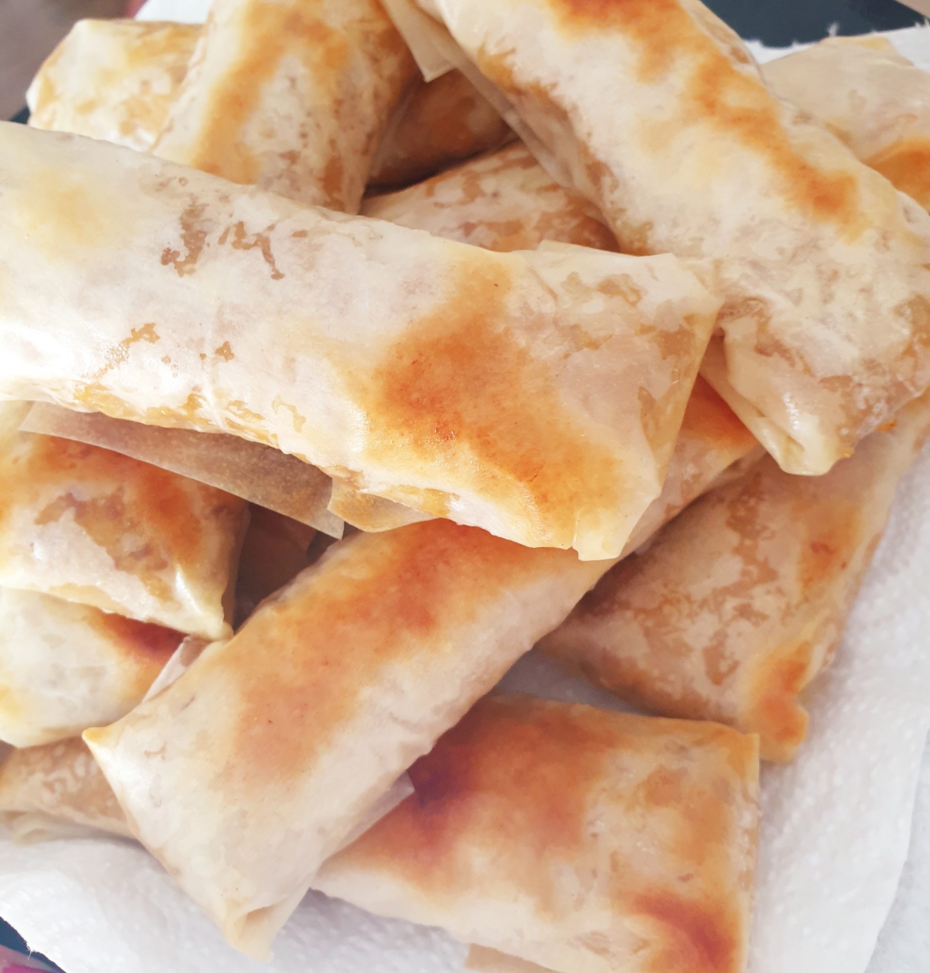 Feuille de brick : 5 minutes de chaque côté dans une poêle chaude avec un fond d'huile.