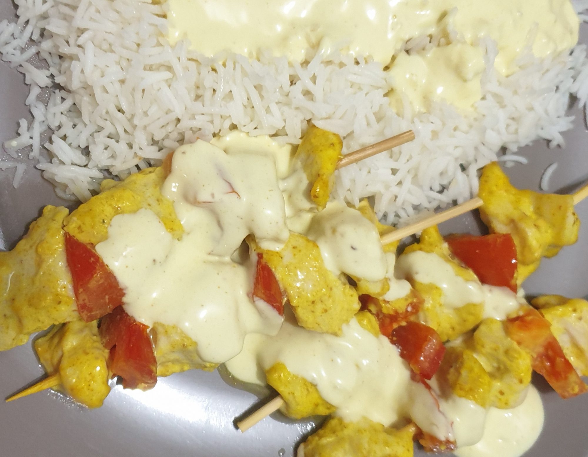 Pendant la cuisson préparez une sauce avec de la crème et un peu de curry pour ajouter sur vos brochettes et son accompagnement