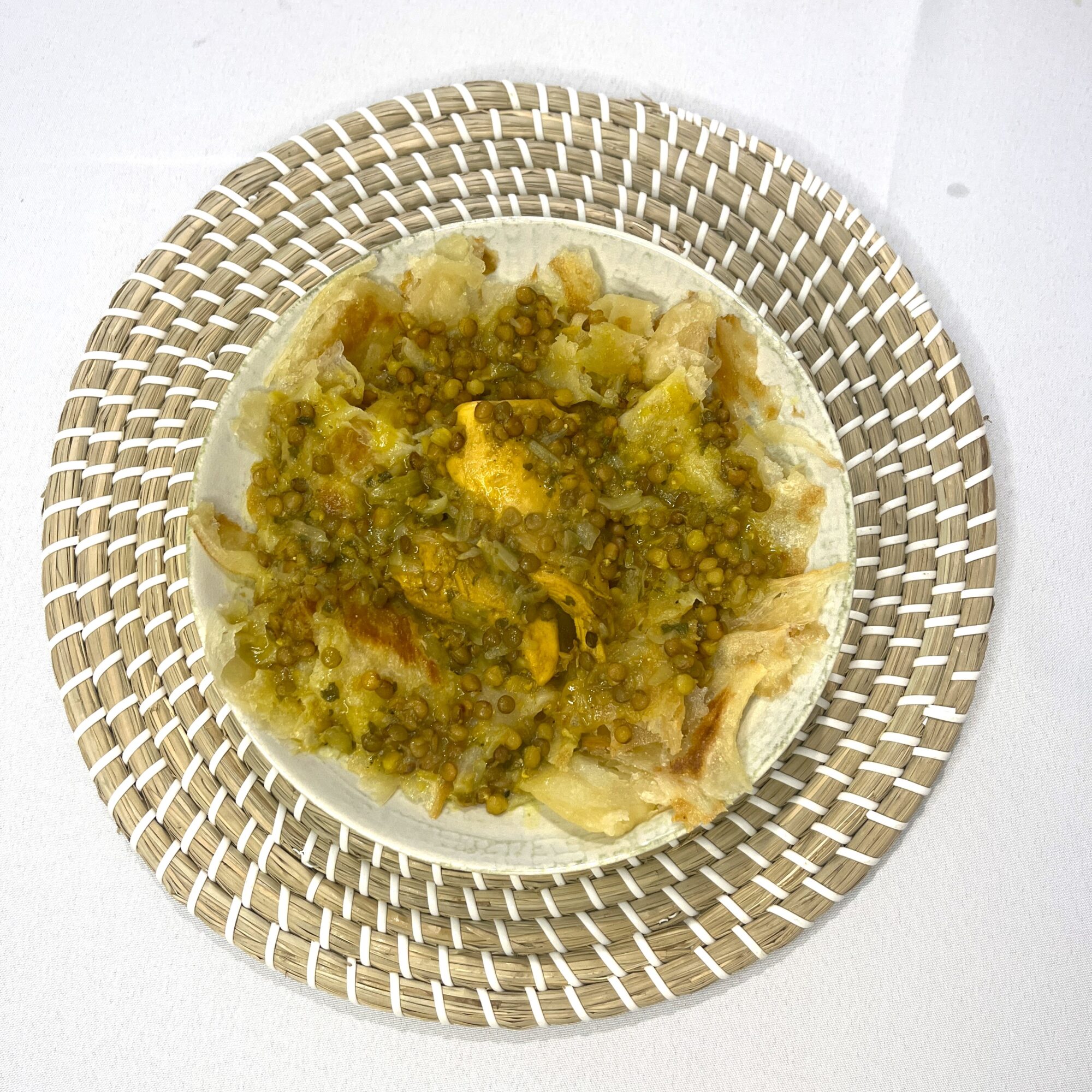 Dans un grand plat, émiettez les msmen et disposez le poulet, lentilles et oignons au milieu du plat.