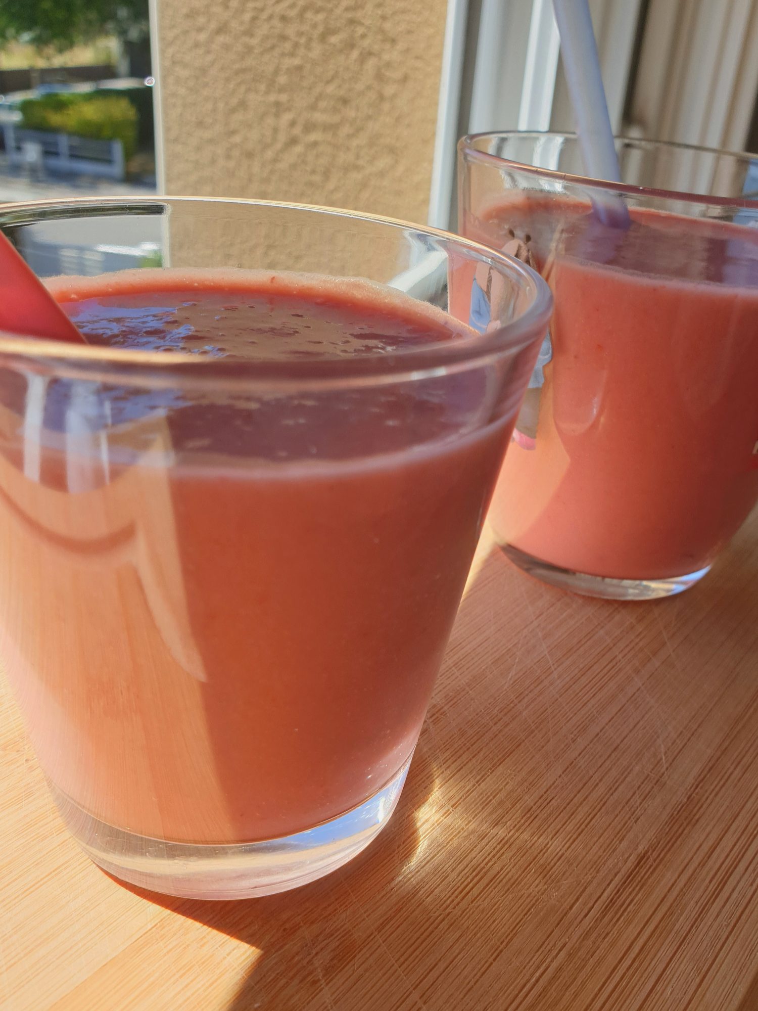Mixez les fraises avec le lait de soja. Ajoutez la moitié de la banane sans la peau.