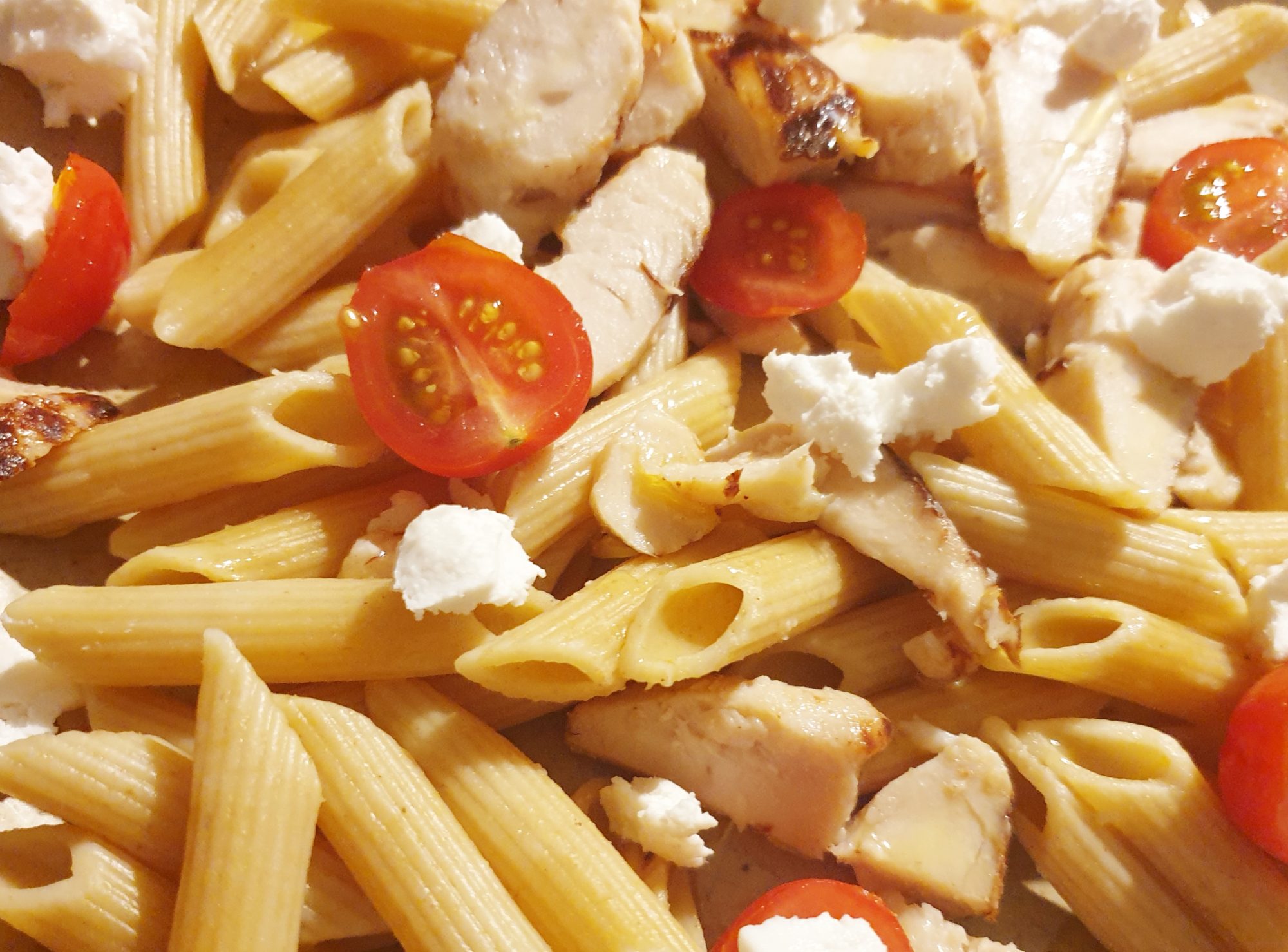 Déposez les tomates cerises, le poulet et le chèvre sur les pâtes.