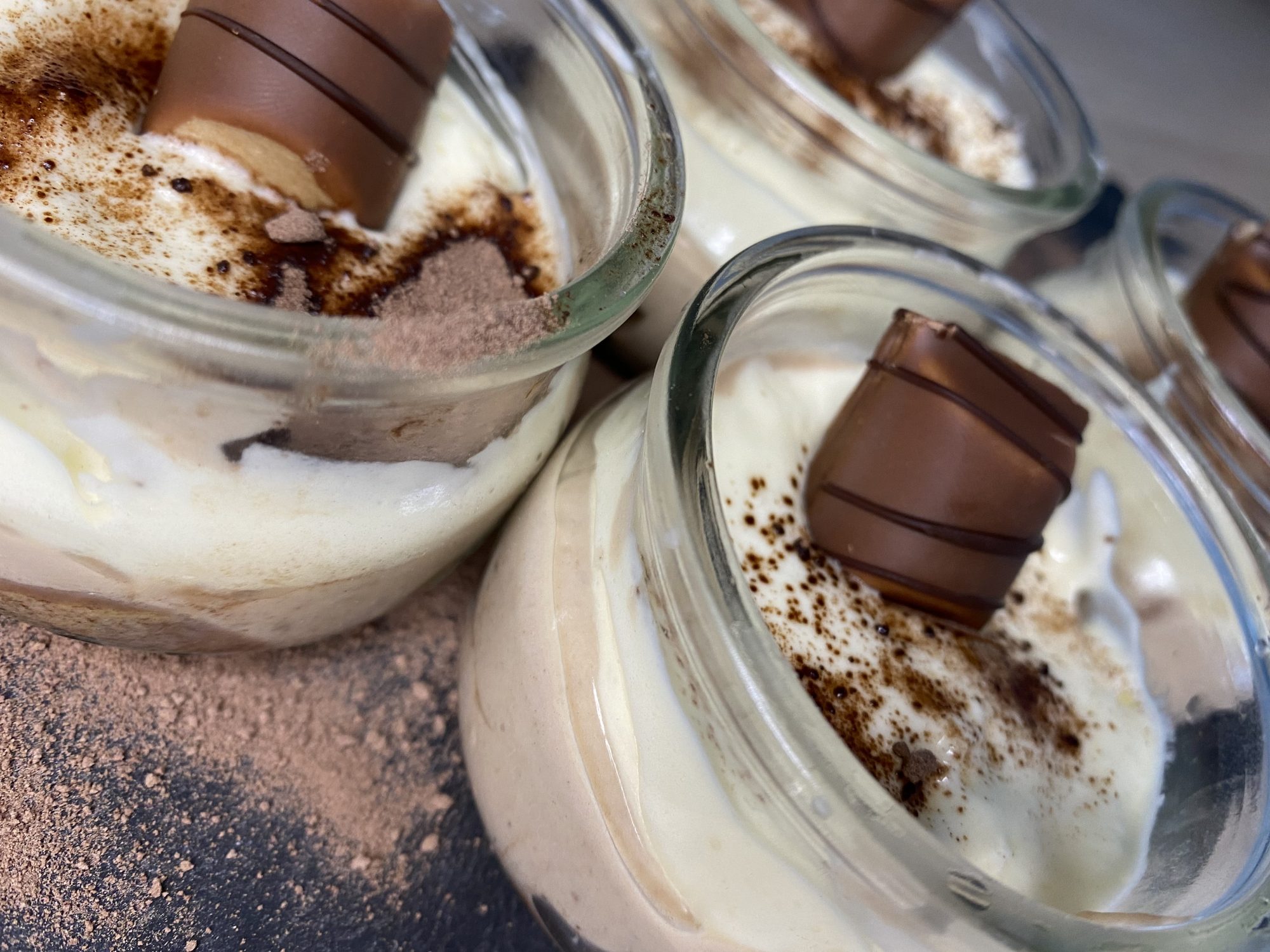 Dans une verrine, déposez une couche de crème de Kinder puis un boudoir que vous aurez imbibé du mélange eau cacao.