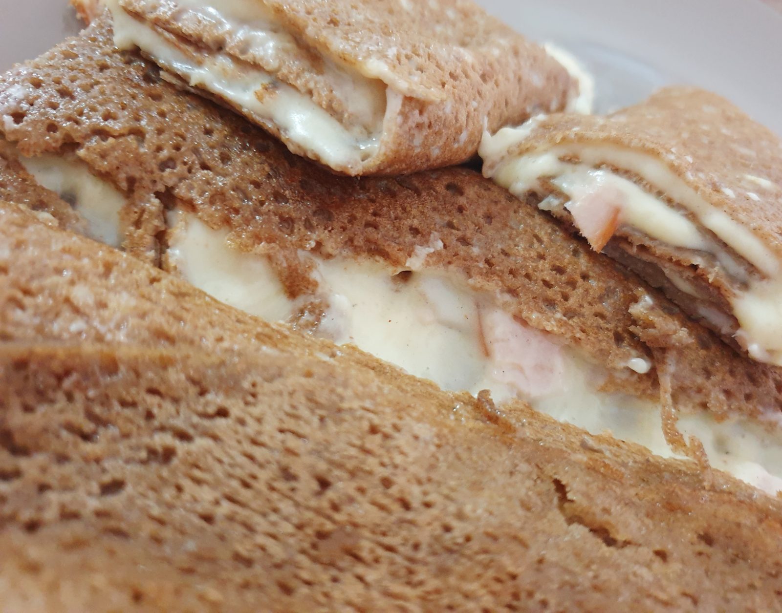 Galette fourrée fait maison avec béchamel et blanc de poulet. Pour un repas rapide et simple qui plaira à tout le monde.