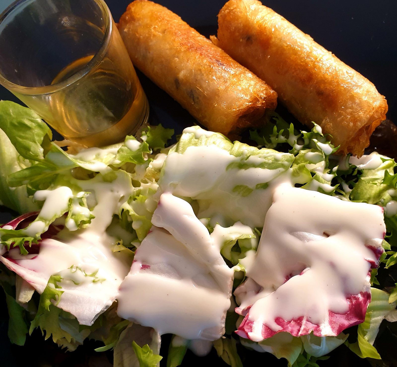 Nems avec salade verte pour un repas original et rapide. Vous pouvez remplacer la salade par des nouilles ou du riz cantonais pour un repas complet.