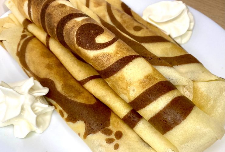 Crêpes tourbillons avec une partie au chocolat et une partie classique. La crêpe roulée permet d’avoir un bel effet. ...